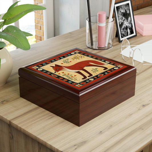 Rustic Folk Art Fox Design Wooden Keepsake Jewelry Box