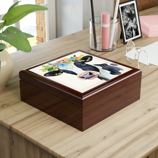 Rustic Folk Art Holstein Cow Portrait Design Wooden Keepsake Jewelry Box