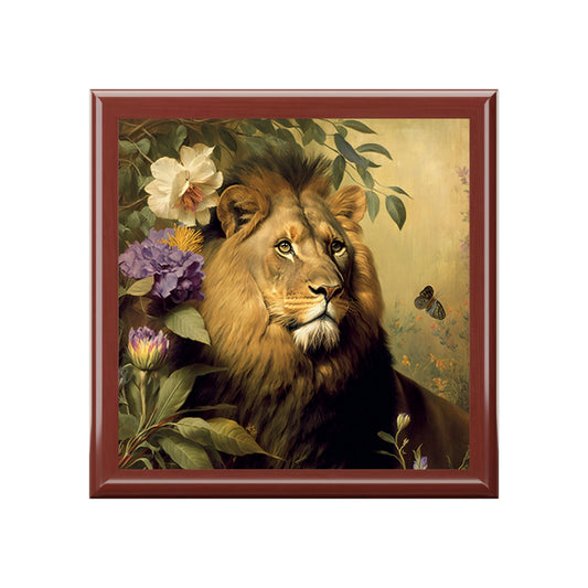 Vintage African Lion Wood Keepsake Jewelry Box with Ceramic Tile Cover