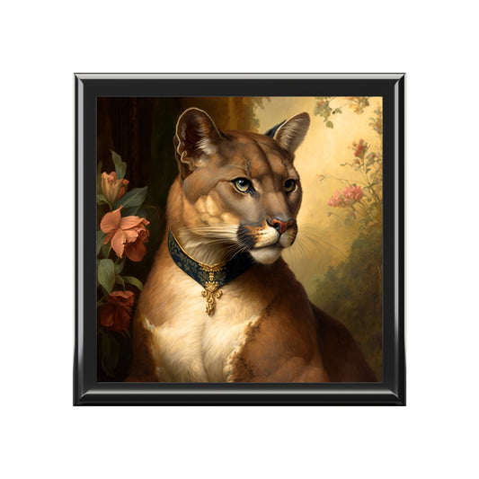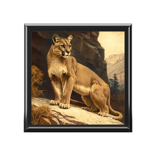 Vintage Antique Mountain Lion Puma Portrait Wood Keepsake Jewelry Box with Ceramic Tile Cover