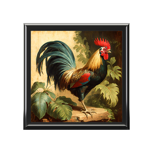 Vintage Antique Rooster Wood Keepsake Jewelry Box with Ceramic Tile Cover