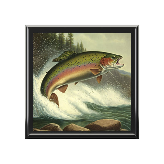 Vintage Antique Trout Wood Keepsake Jewelry Box with Ceramic Tile Cover