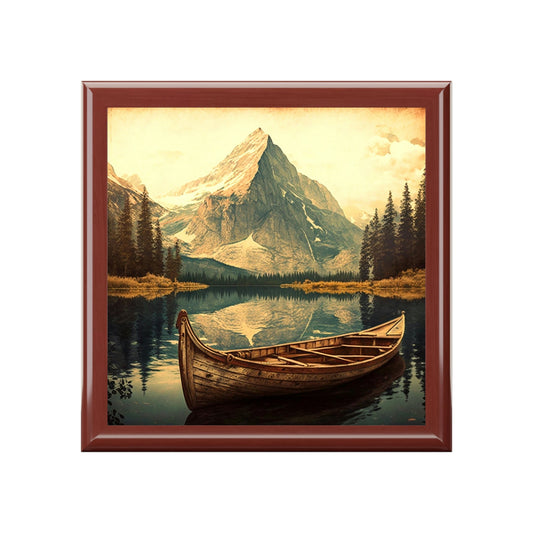 Vintage Canoe Wood Keepsake Jewelry Box with Ceramic Tile Cover
