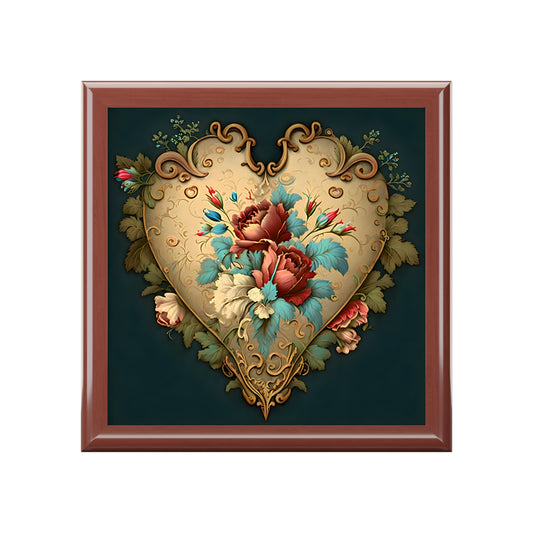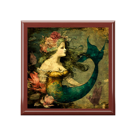Vintage Mermaid Wood Keepsake Jewelry Box with Ceramic Tile Cover