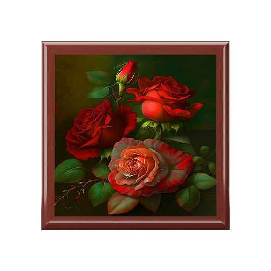 Vintage Roses Wood Keepsake Jewelry Box with Ceramic Tile Cover