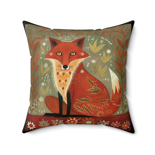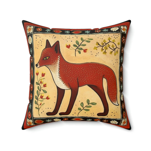 Folk Art Fox Design Square Pillow - Cottagecore Country Farm Style Gift for Yourself or Loved Ones