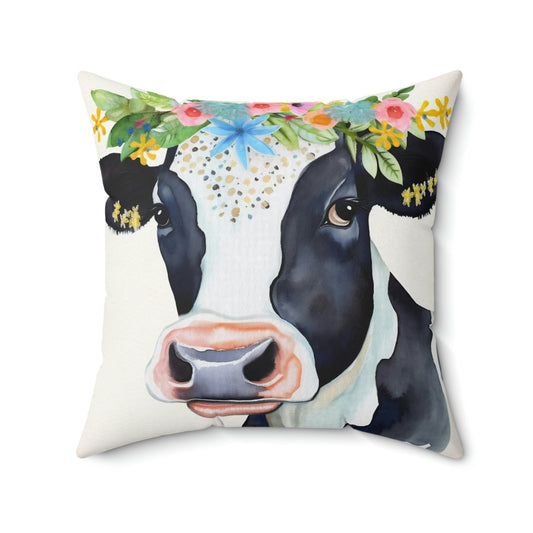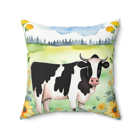 Folk Art Holstein Cow in Field Design Square Pillow - Cottagecore Country Farm Style Gift for Yourself or Loved Ones
