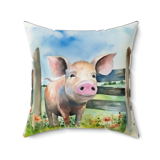 Folk Art Pig in the Barnyard Design Square Pillow - Cottagecore Country Farm Style Gift for Yourself or Loved Ones