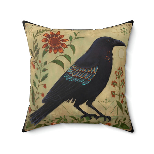 Folk Art Rustic Raven Design Square Pillow - Cottagecore Country Farm Style Gift for Yourself or Loved Ones