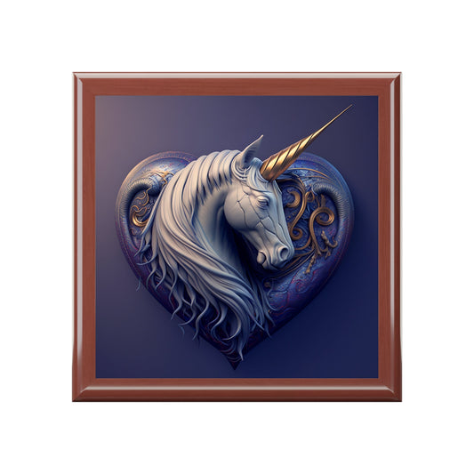 Purple Lavender Unicorn Heart Wood Keepsake Jewelry Box with Ceramic Tile Cover