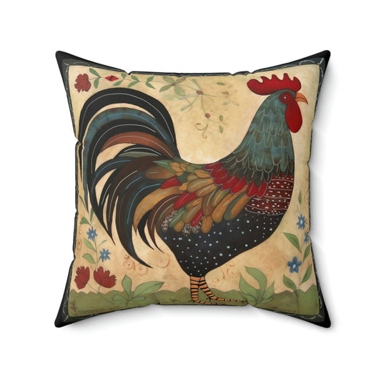 Rustic Folk Art Rooster Design Square Pillow - Cottagecore Country Farm Style Gift for Yourself or Loved Ones