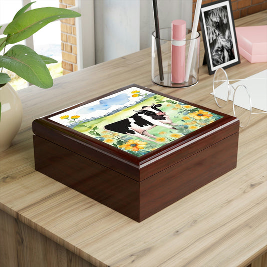 Rustic Folk Art Watercolor Holstein Cow Design Wooden Keepsake Jewelry Box