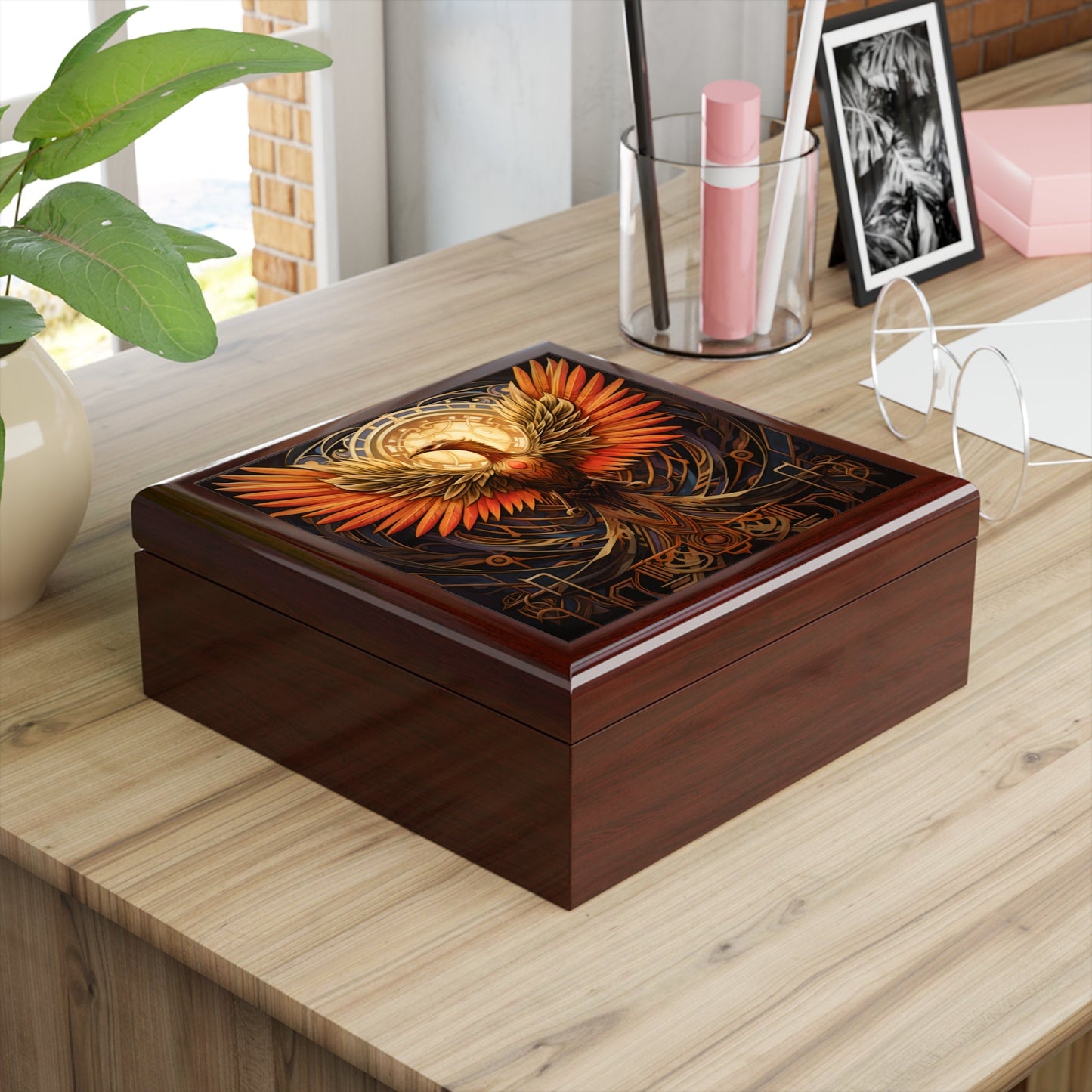 Unveil the mythical allure of our Phoenix Wood Jewelry and Trinket Box, a 6" x 6" masterpiece that encapsulates the timeless legend of rebirth and renewal. This captivating box features a ceramic tile lid adorned with the resplendent image of the Phoenix, making it a gift that carries the essence of myth and mystique.