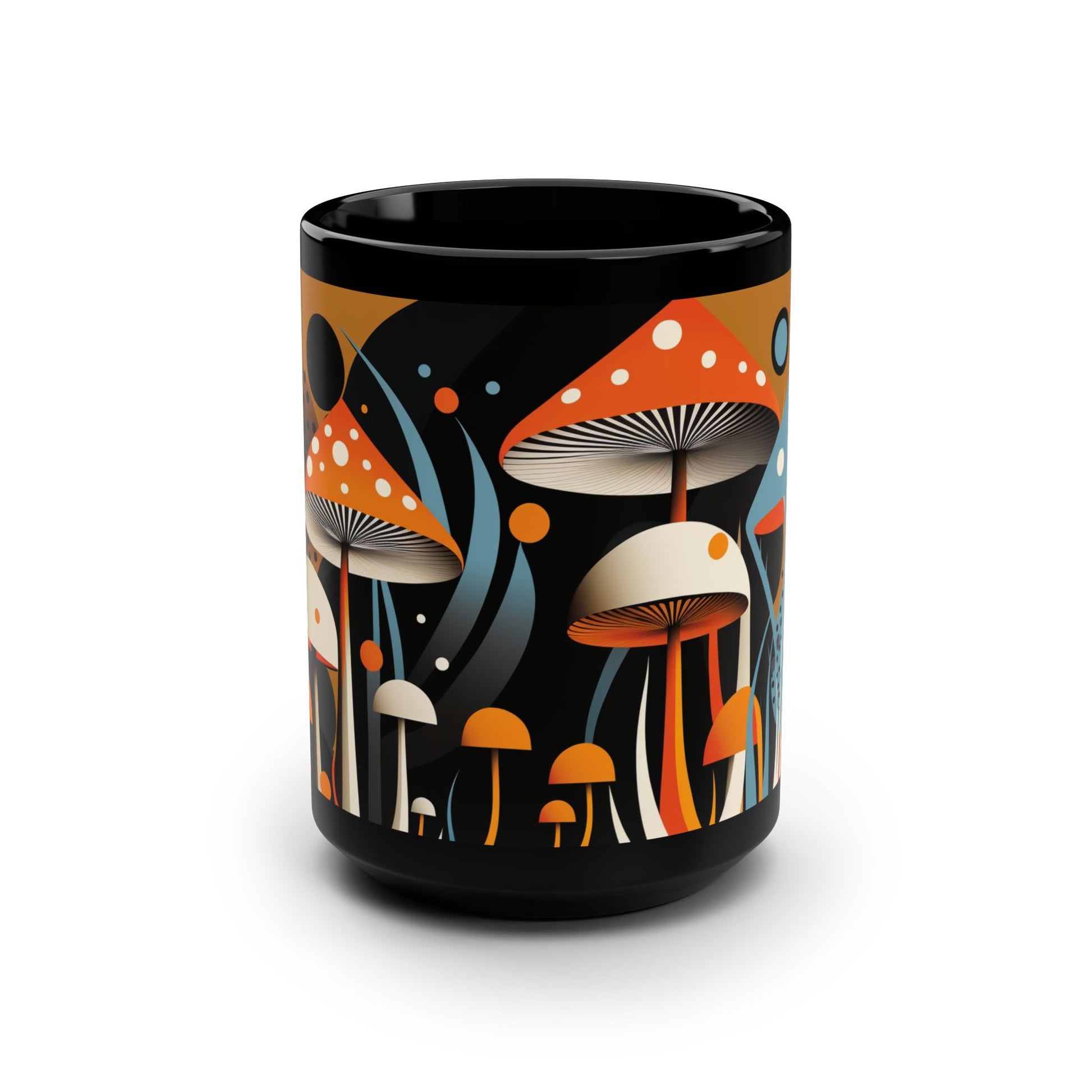 Sip into a late-night forest of color. This 15oz black ceramic mug wraps a bold, retro-inspired mushroom illustration around its glossy surface — deep blacks, warm ochres, and pops of blue create a cozy, slightly mysterious vibe. It feels like finding a secret clearing: slow mornings or creative evenings unfold with each warm cup. The sturdy C-handle sits comfortably in hand; the larger 15oz capacity holds generous pours of coffee, tea, or cocoa. For anyone who loves vintage illustration, mycology motifs, or atmospheric kitchenware, this mug brings a little story and a lot of character to everyday rituals and relaxed gatherings.
